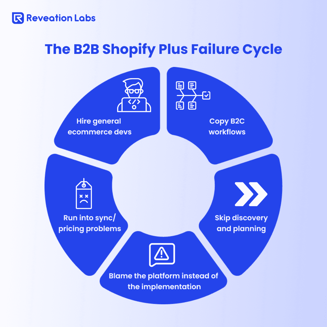 Companies use consumer-focused themes and workflows for business buyers. They miss B2B-specific features that Shopify Plus actually offers. They treat complex business processes like simple consumer purchases.