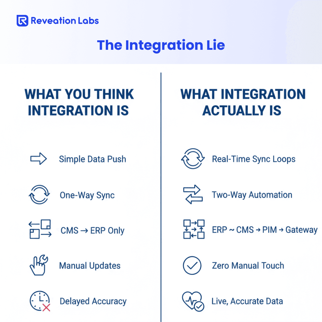 Here at Reveation Labs, we don't just 'connect' your systems; we make them talk to each other like best friends. We focus on these exact seven strategies, seamlessly integrating your CMS, ERP, PIM, Payment Gateway, and Tax solutions.