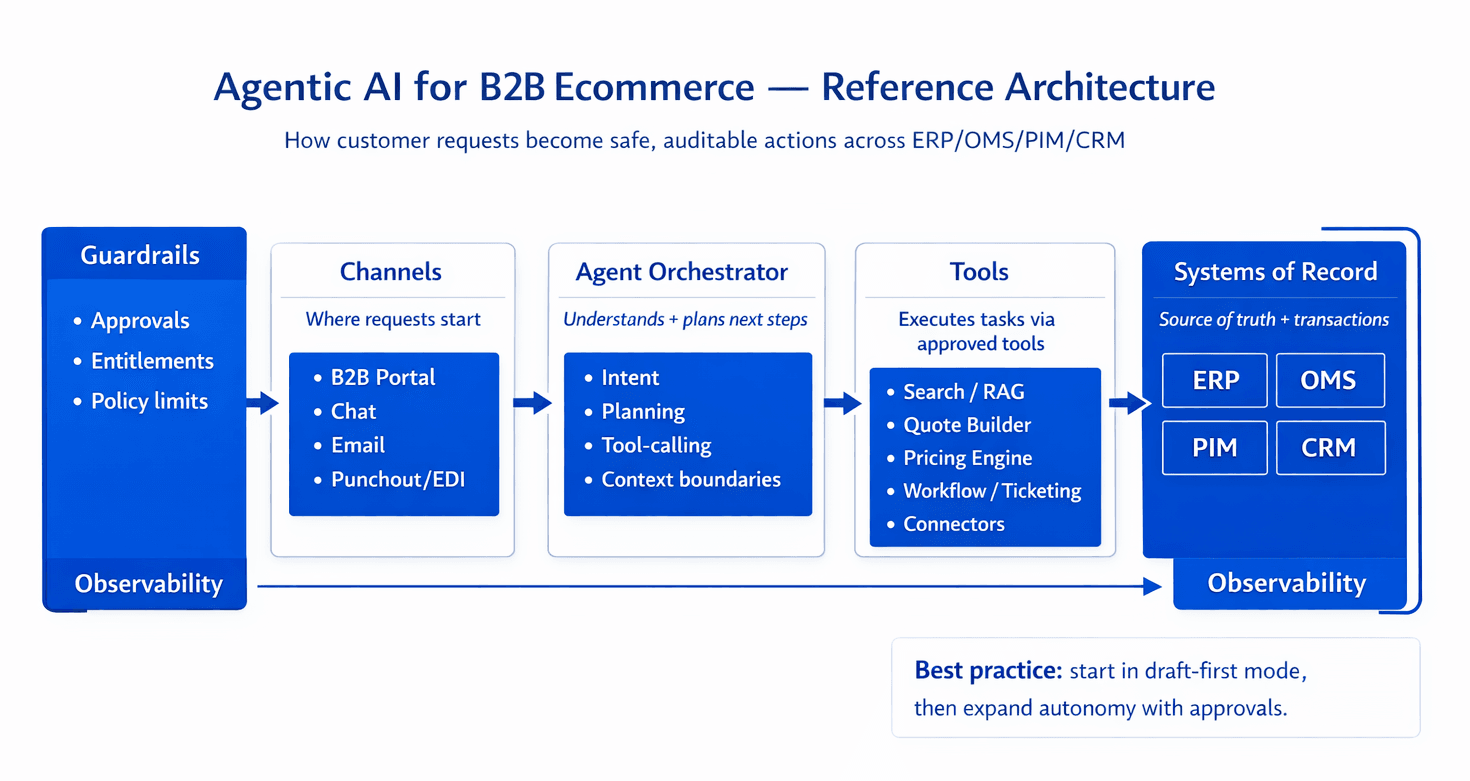 Many ecommerce platforms already include AI-driven search, recommendations, or support chat. Agentic AI is different because it can plan and execute steps—like preparing a quote draft, validating customer entitlements, or initiating an RMA workflow. In B2B, that only matters when the agent is connected to systems of record and governed with approval controls.