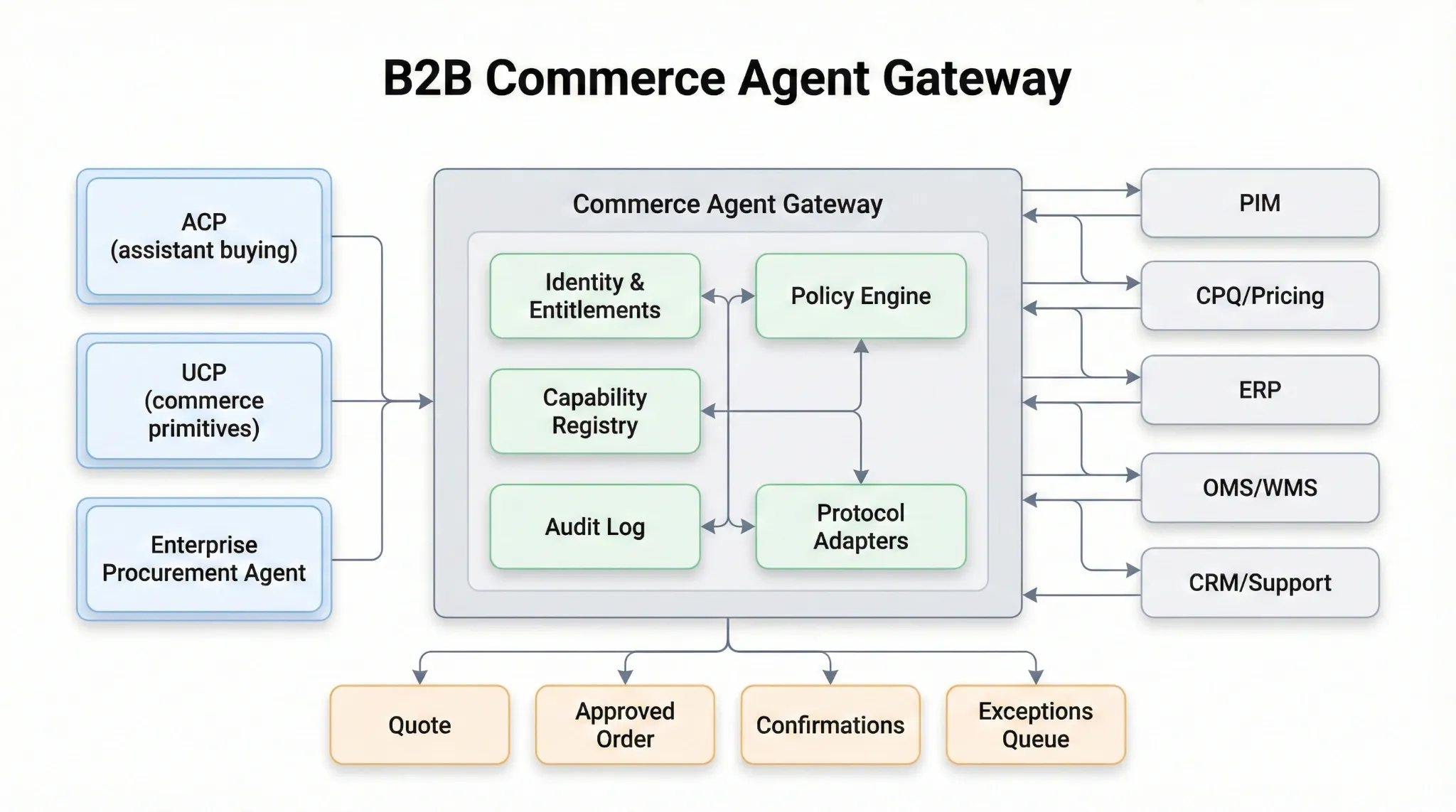 It exposes what agents actually need: structured product knowledge, contract pricing and entitlements, availability promises, quote-to-order actions, and a provable audit trail. Then you implement protocol adapters (UCP/ACP) without duplicating your core logic for every new surface.