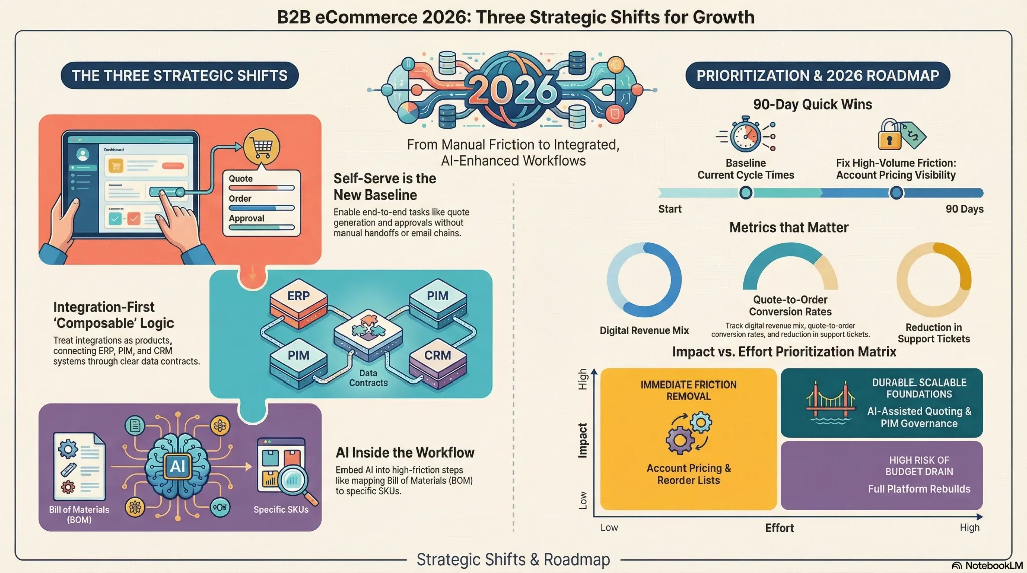 In the next 90 days, pick one buyer journey that represents real volume and pain, often reorder, quote, or support. Establish a baseline (time-to-quote, error rate, tickets per order, conversion), then remove steps until the standard path is fast and predictable.