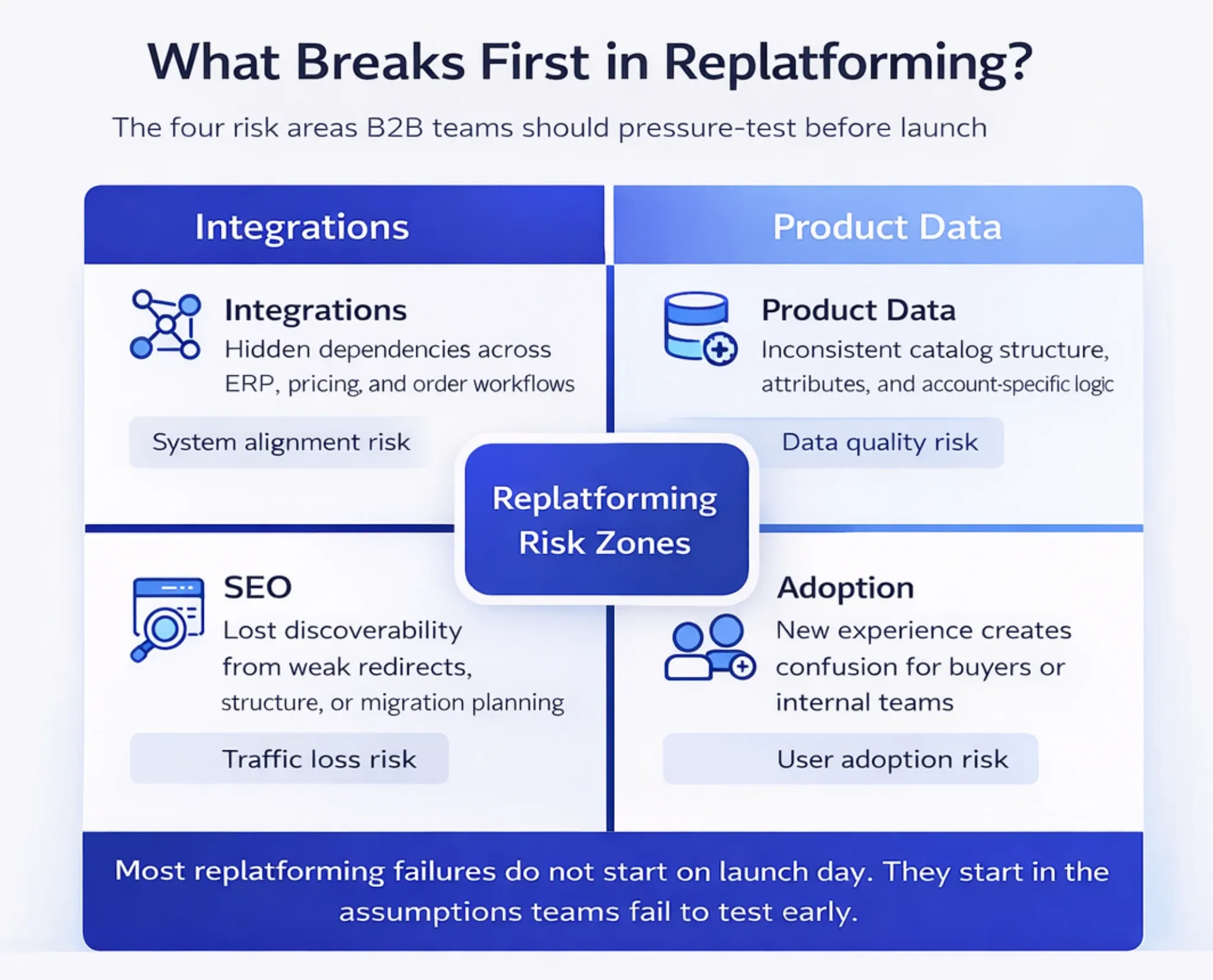 In most projects, one of four things breaks first: integrations, product data, SEO, or adoption. Teams often spend too much time on launch planning and not enough time pressure-testing how the new system will behave under real complexity. That is where risk hides.