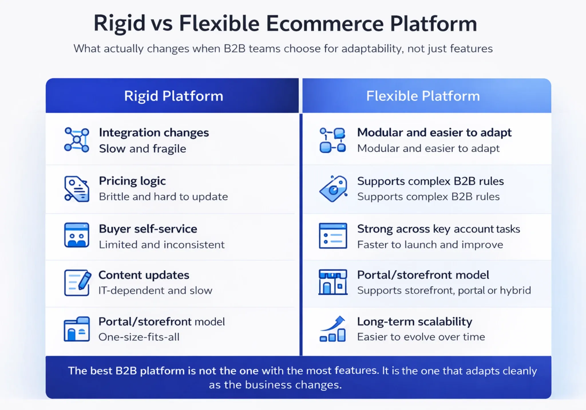 Rigid commerce systems rarely fail all at once. They slow launches, create workarounds, and turn simple buyer needs into expensive operational problems. In B2B, that drag compounds fast because pricing, product data, ERP logic, and self-service all have to work together.