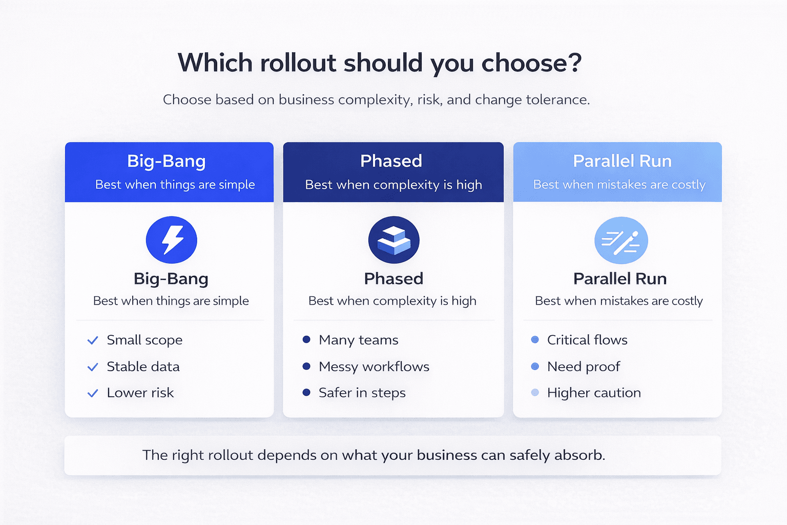 A big-bang launch is a business decision, not just a delivery decision. If the business cannot absorb errors in pricing, inventory, or ordering, the launch model should reflect that.