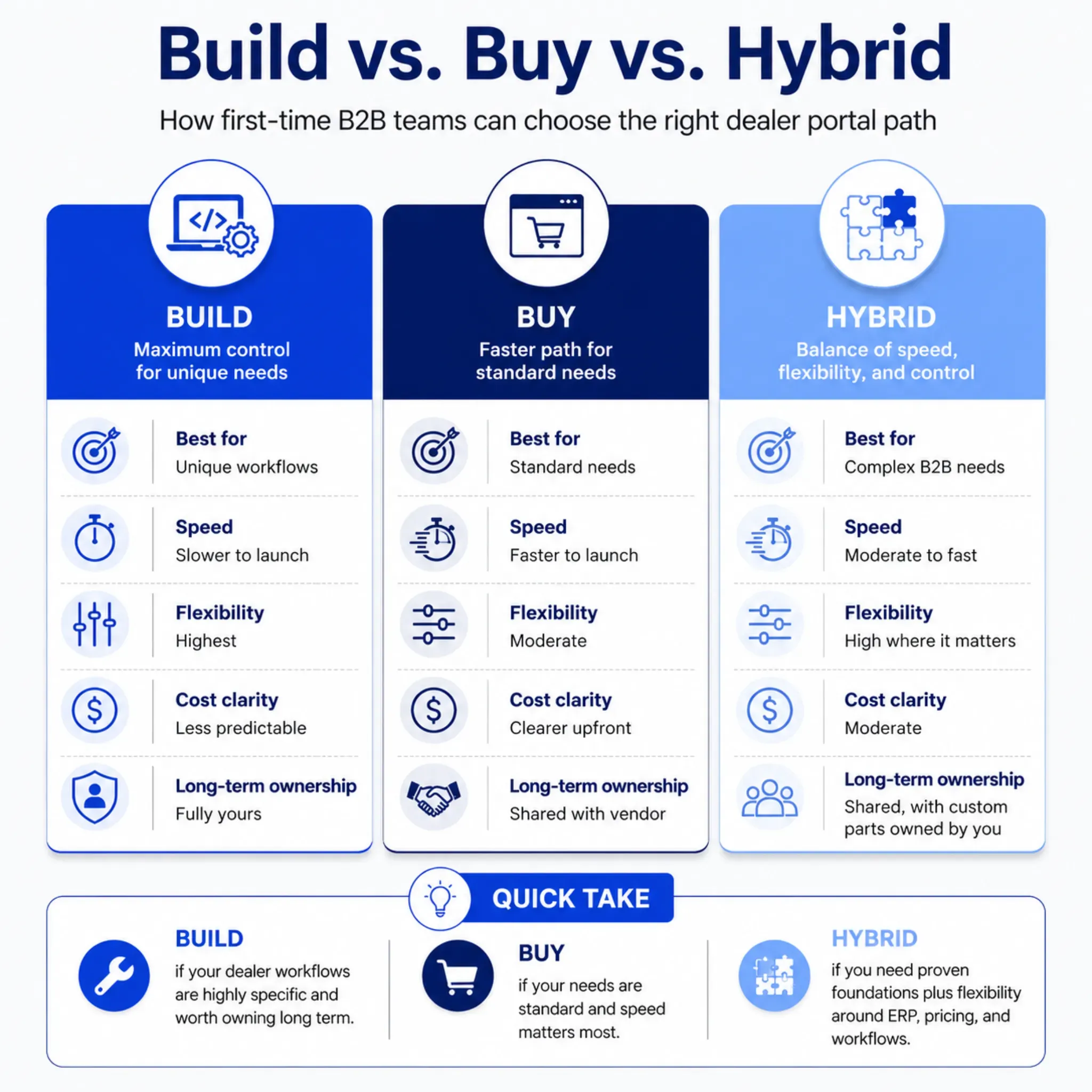 It is about what your dealers need, what your systems can support, and what your team is ready to maintain. Build gives control. Buy gives speed. Hybrid often gives first-time B2B teams the balance they need.