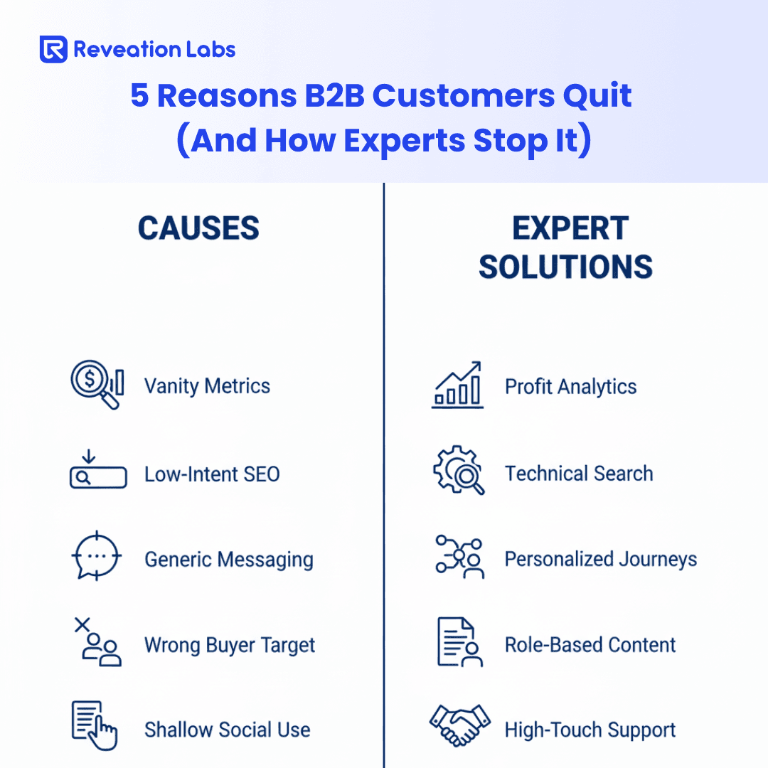 Reveation Labs delivers B2B-specific solutions built by ecommerce marketing experts who understand complex contracts and technical specifications. We eliminate the friction causing silent churn.