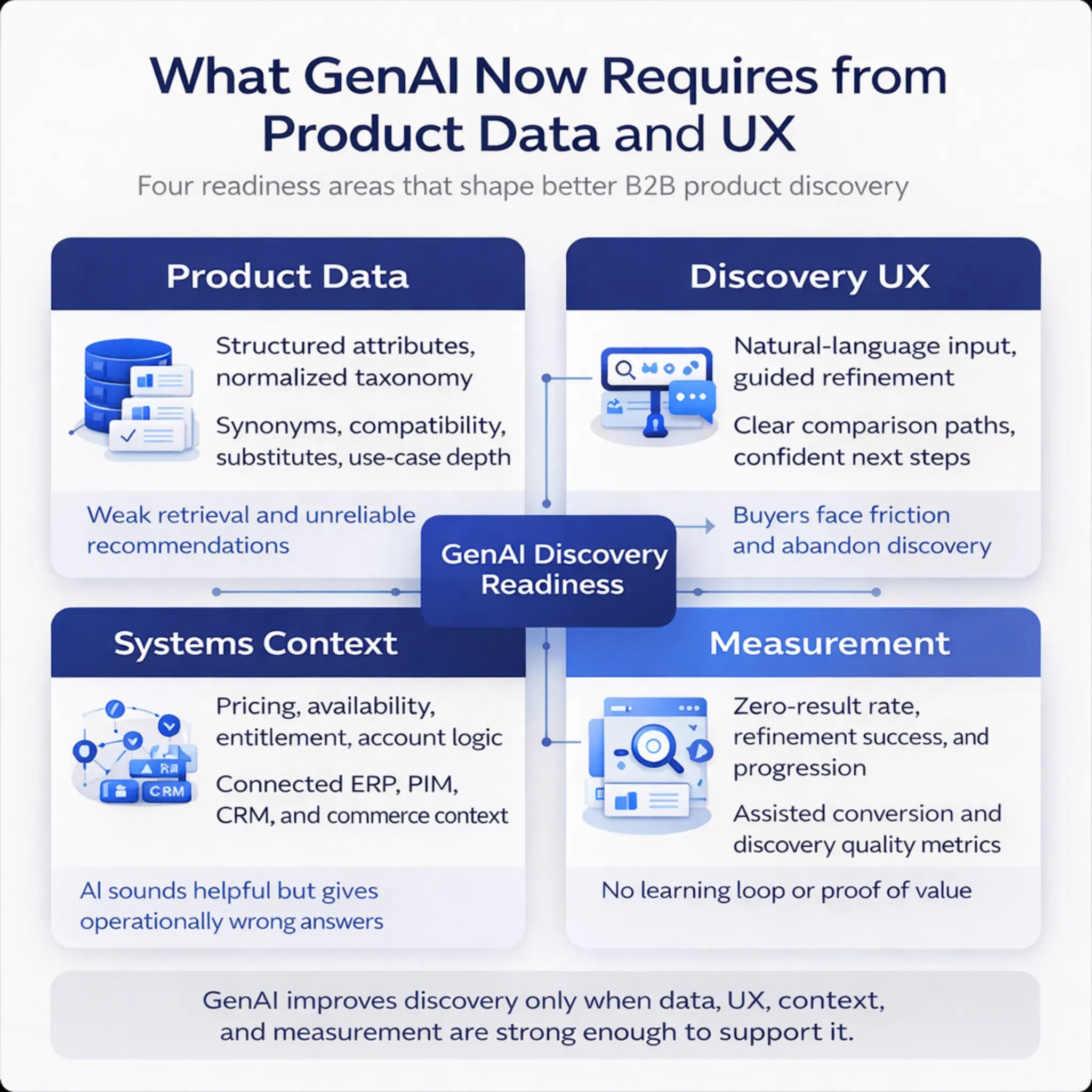 This is closely related to themes we have already explored in our article on GenAI product discovery and agentic AI in B2B commerce. The difference here is practical: once GenAI becomes part of discovery, the operational demands on your catalog, UX, and data model increase immediately.