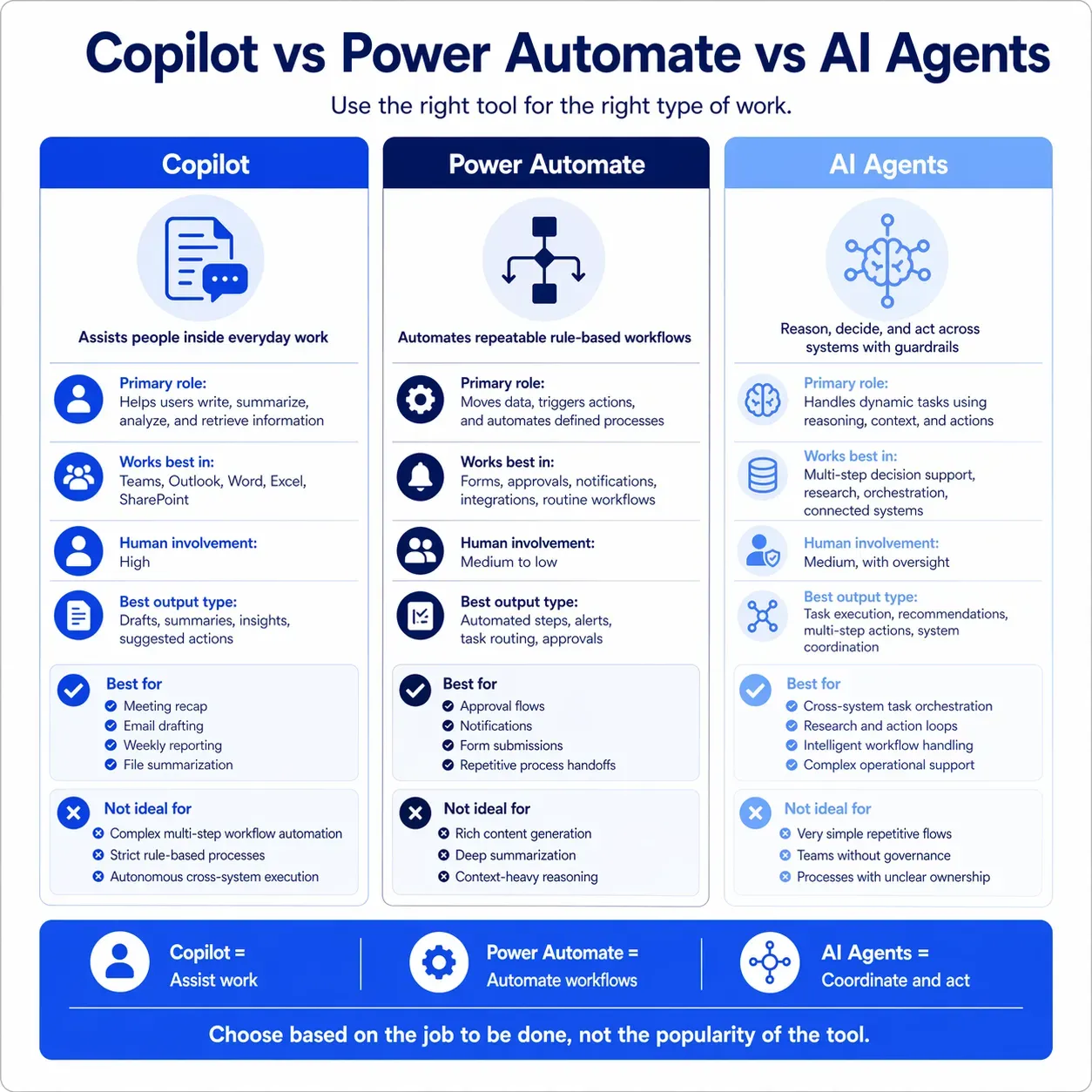 | Copilot replaces automation tools | It complements tools like Power Automate | You need both intelligence and orchestration |