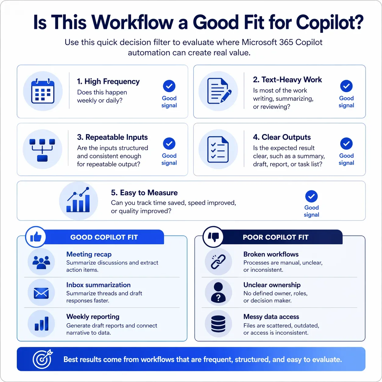 Watch for this risk: If leadership expects full automation but the workflow still depends on manual handoffs, unclear ownership, or inconsistent data, Copilot adoption will disappoint even if usage looks high.