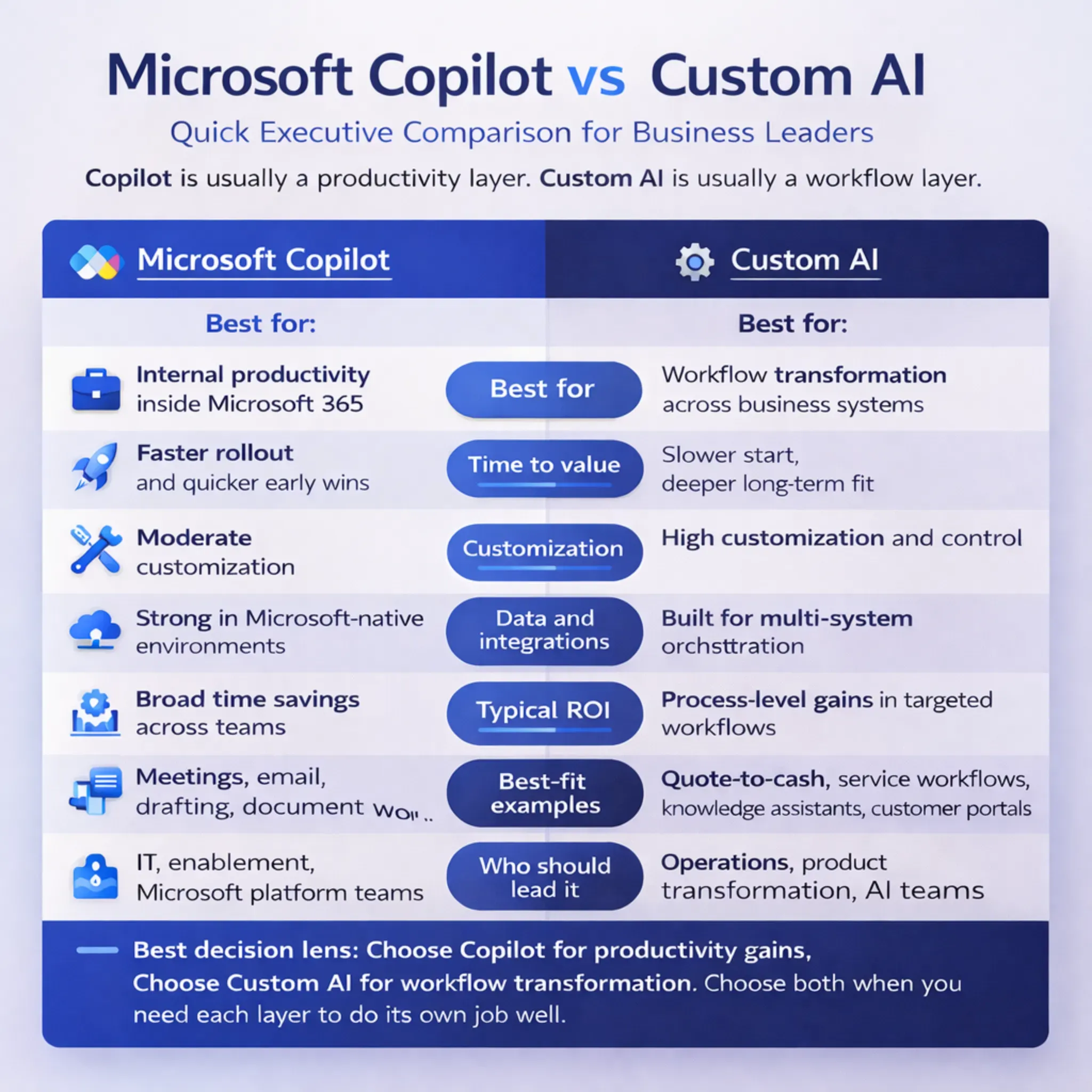 Key idea: Copilot is usually a productivity layer. Custom AI is usually a workflow layer. That framing makes the decision much easier.